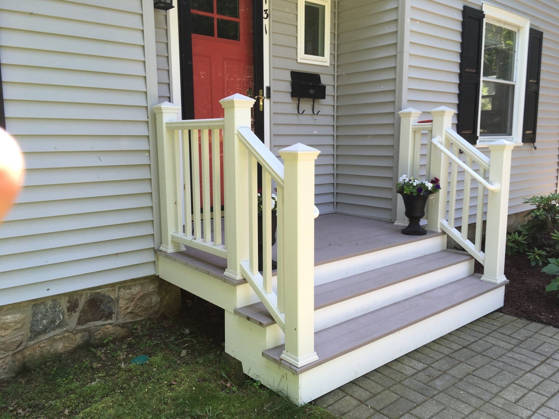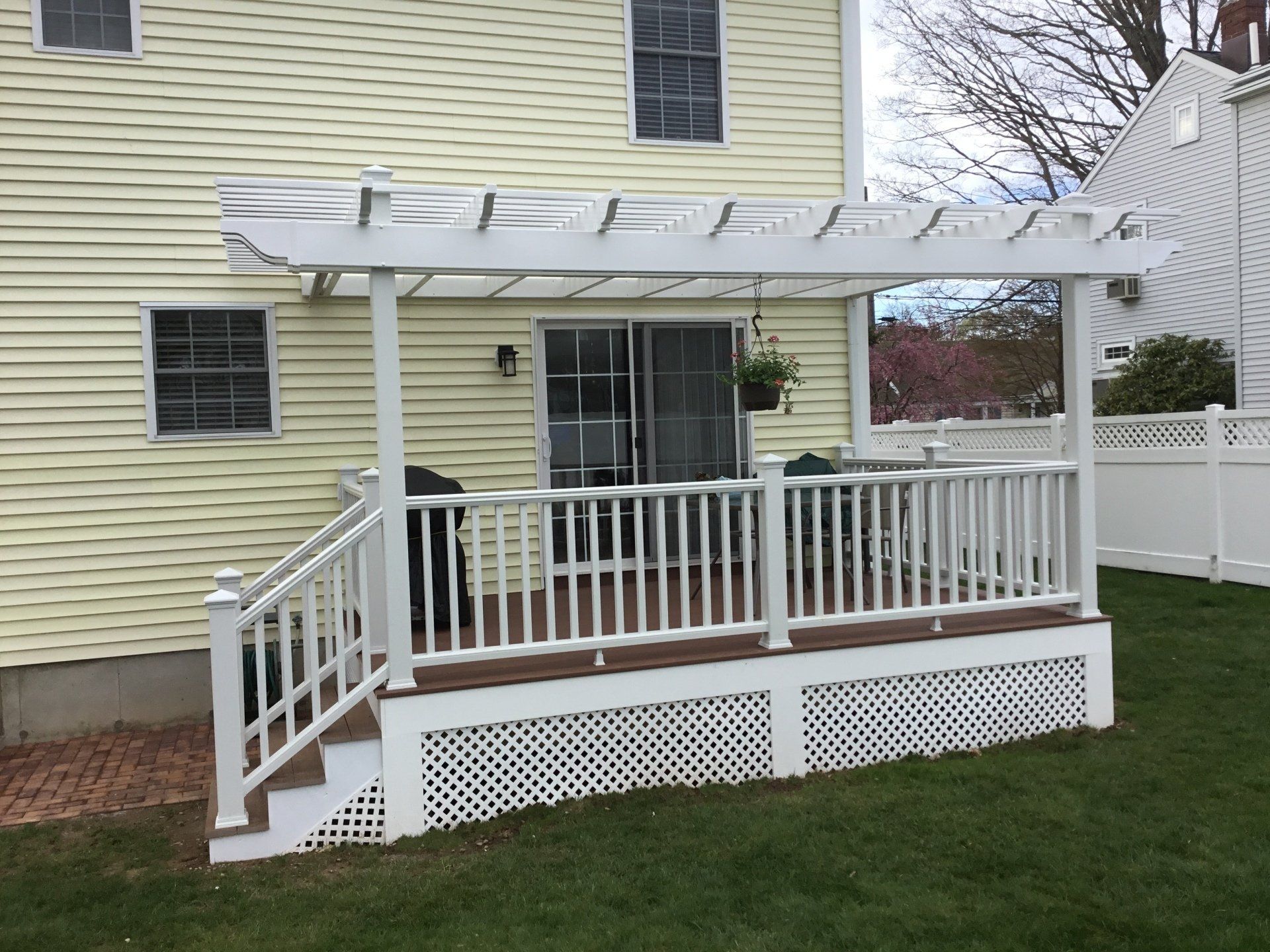 Deck with all white railings/Azek (mahogany) decking / lattice and shade pergola
