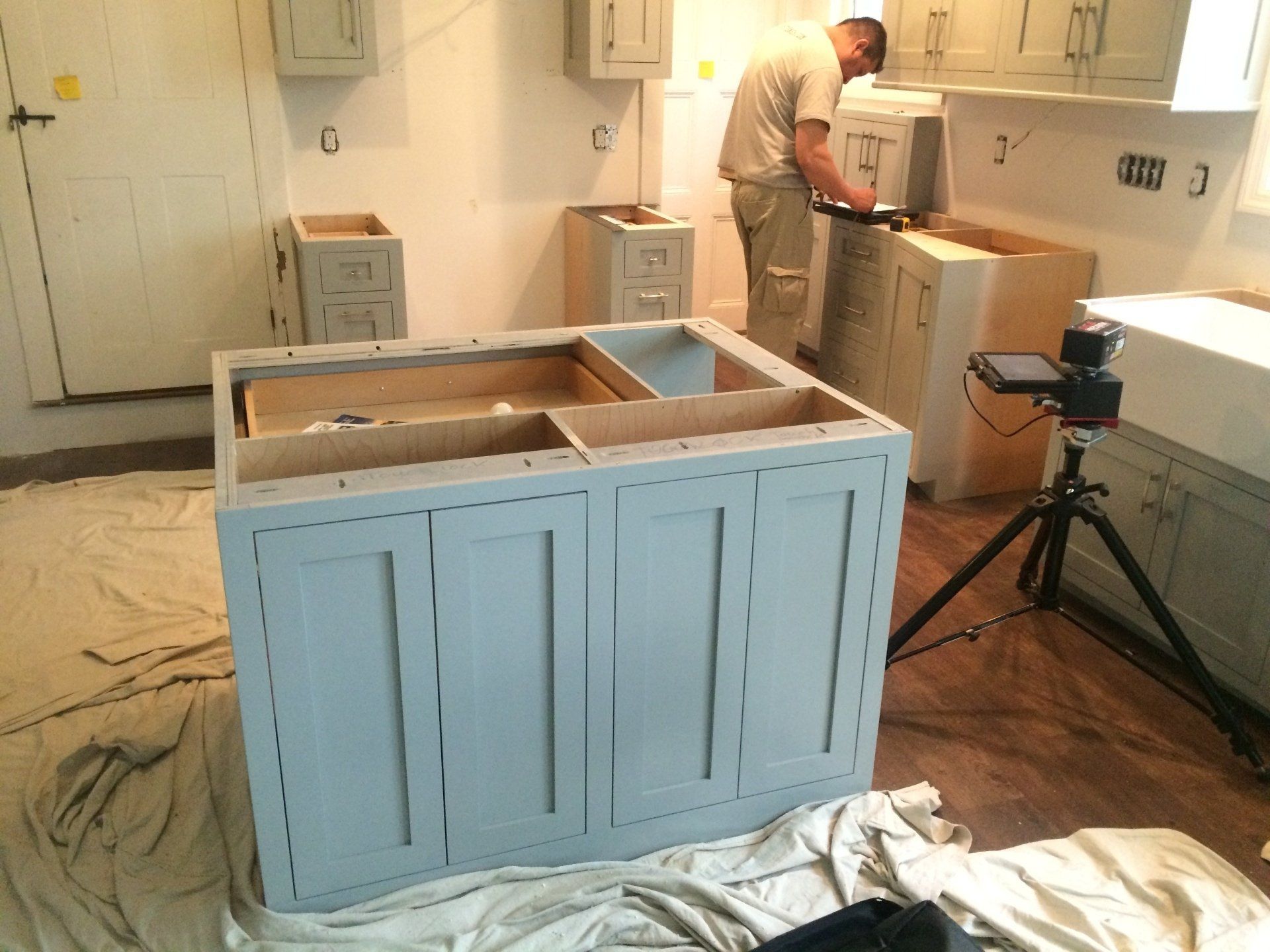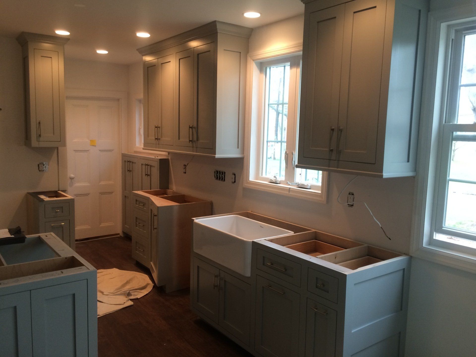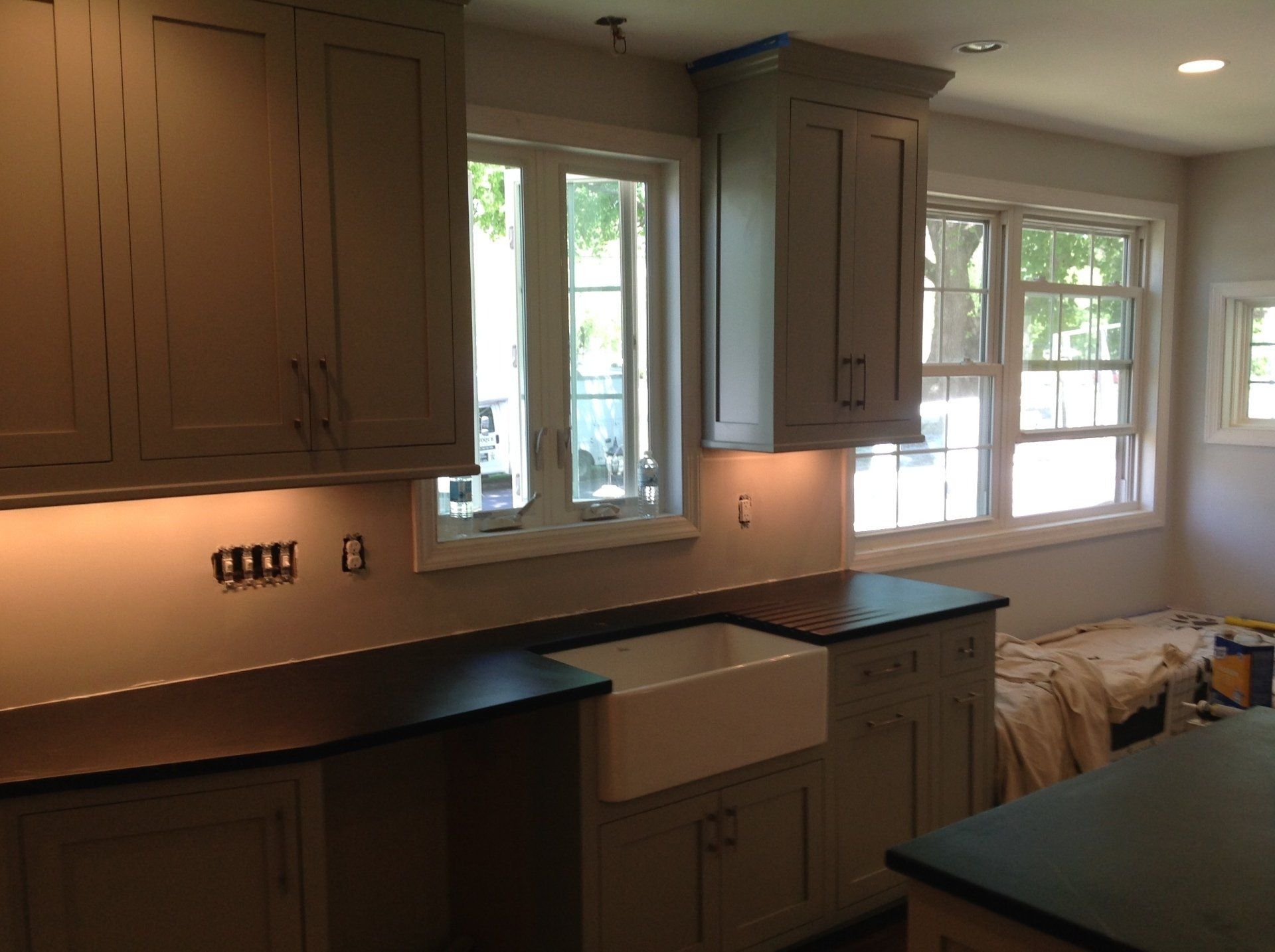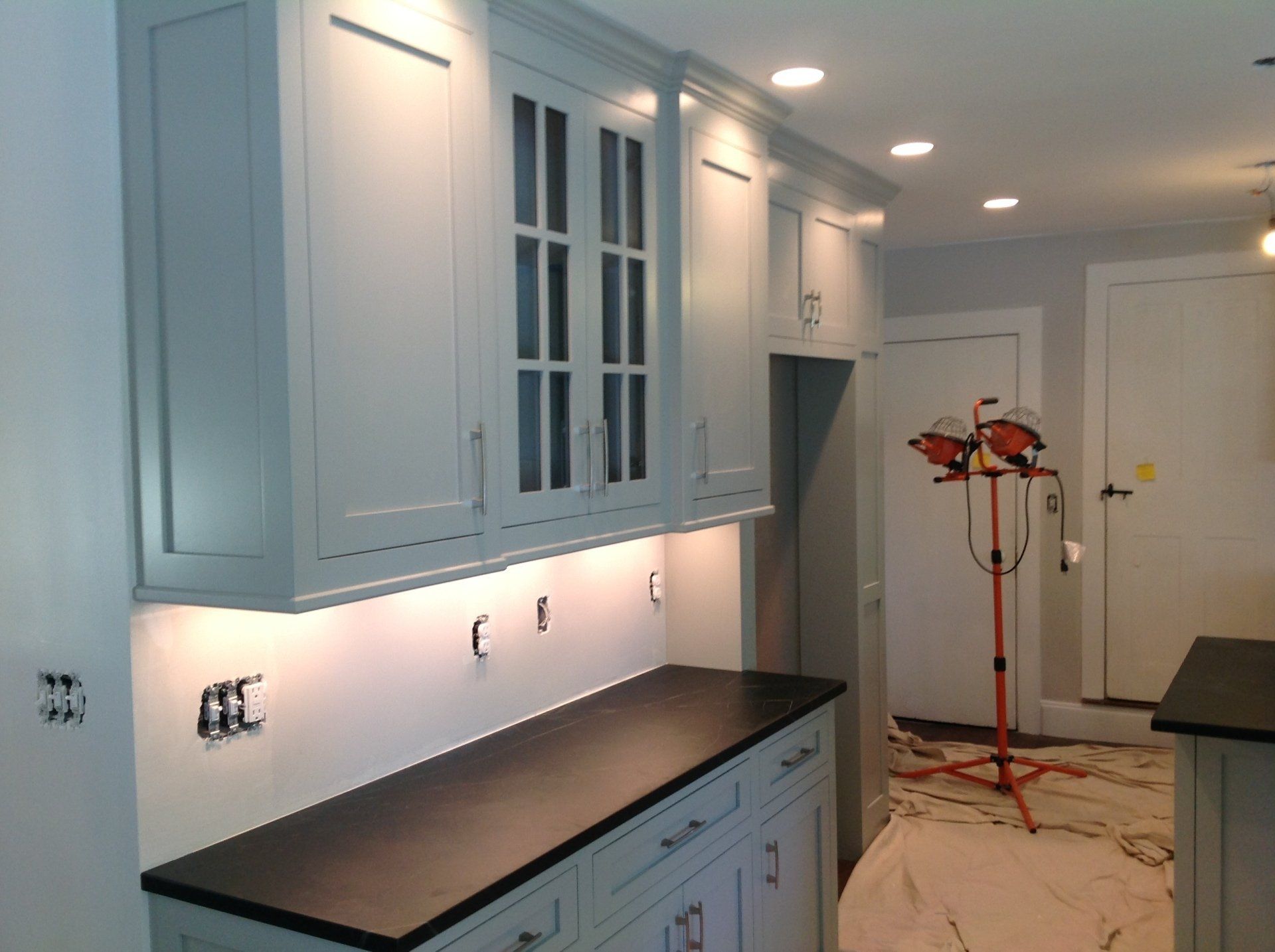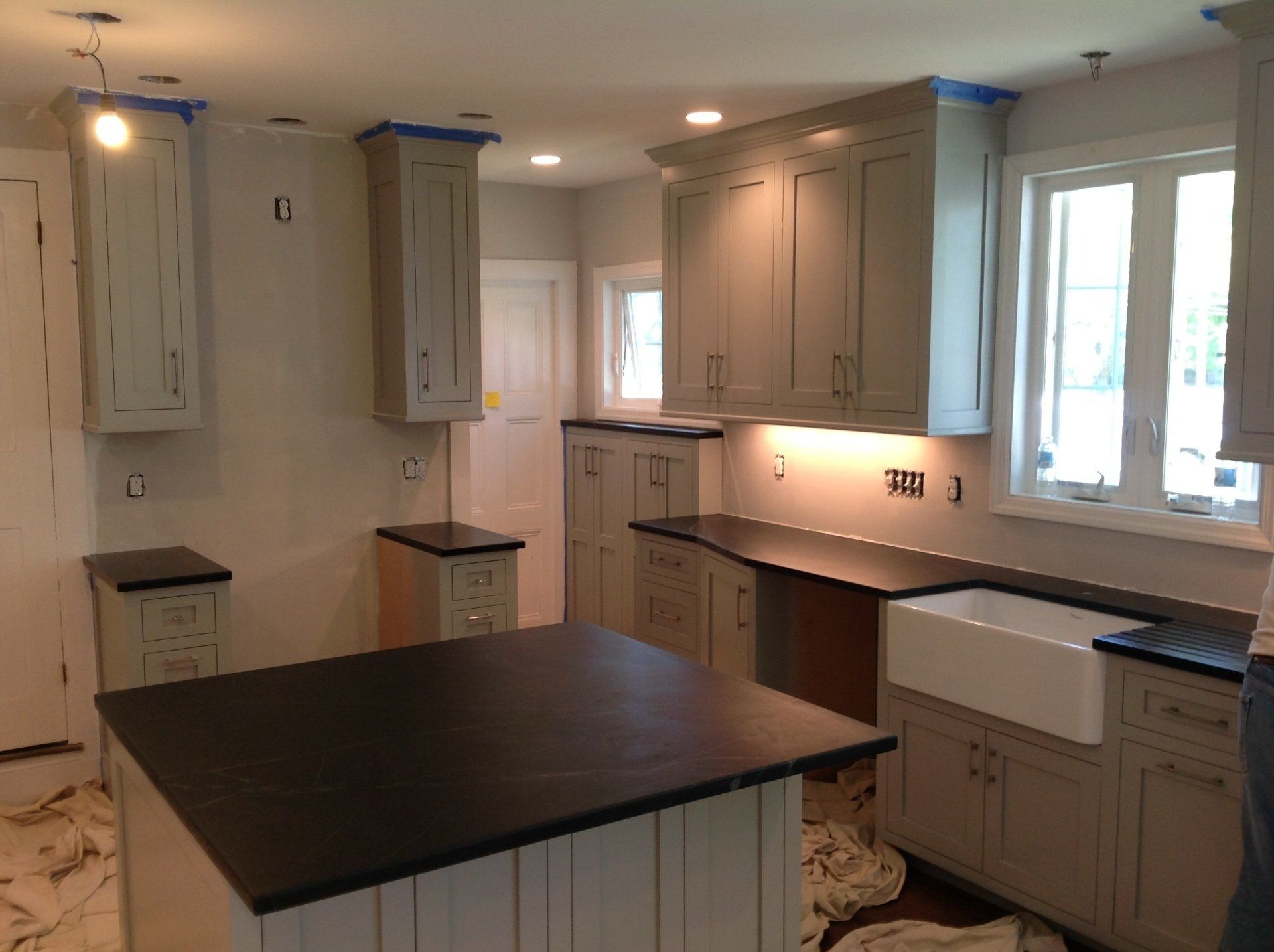 Custom gray shaker style with glass doors/farm sink/ soapstone counters with carved drain board/recessed ceiling lighting and under cabinet lighting