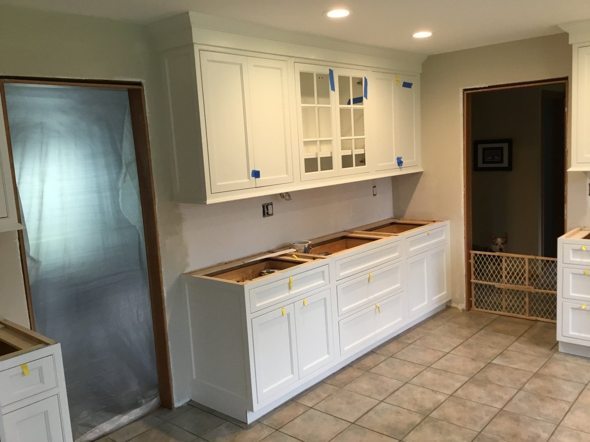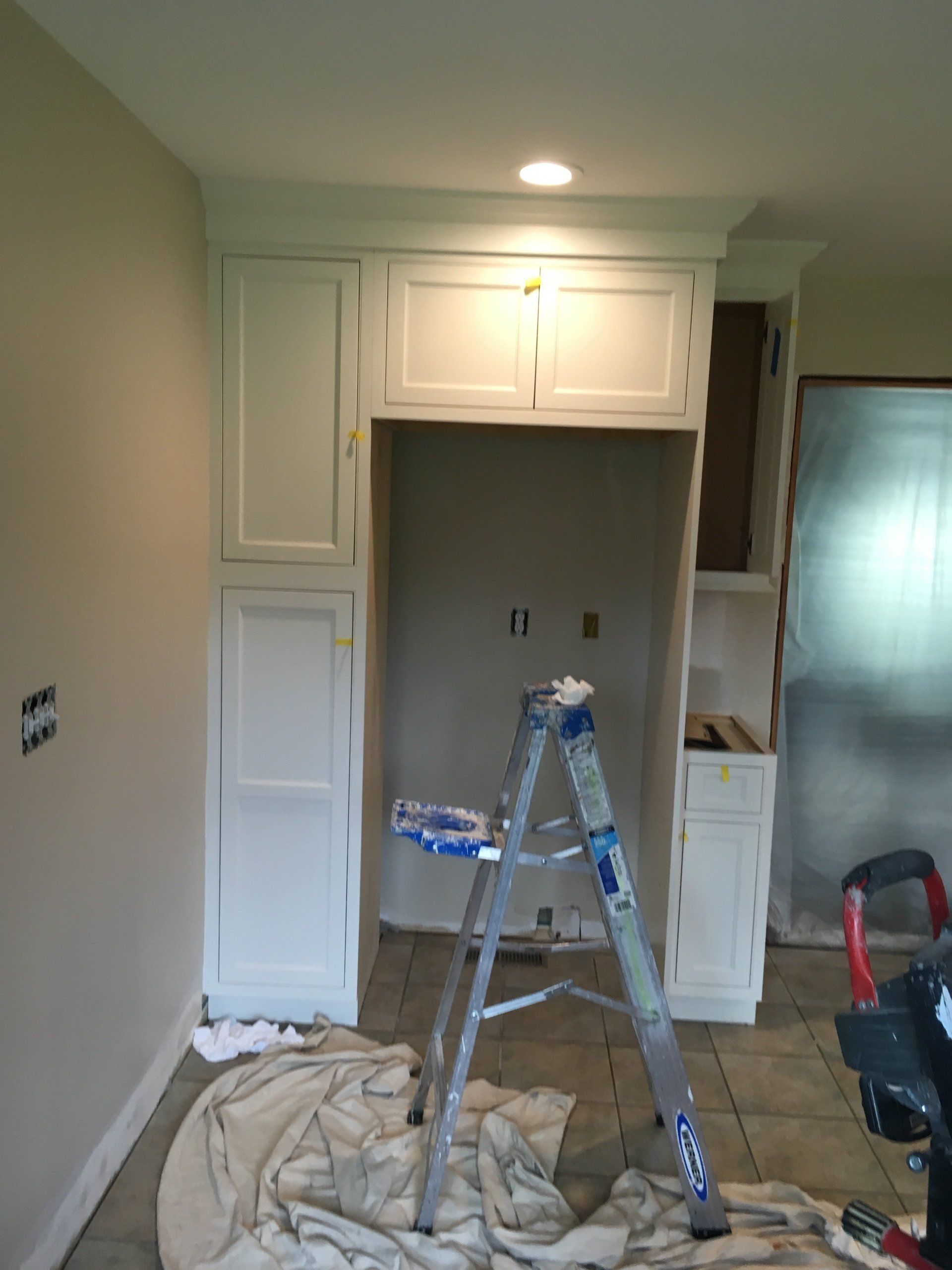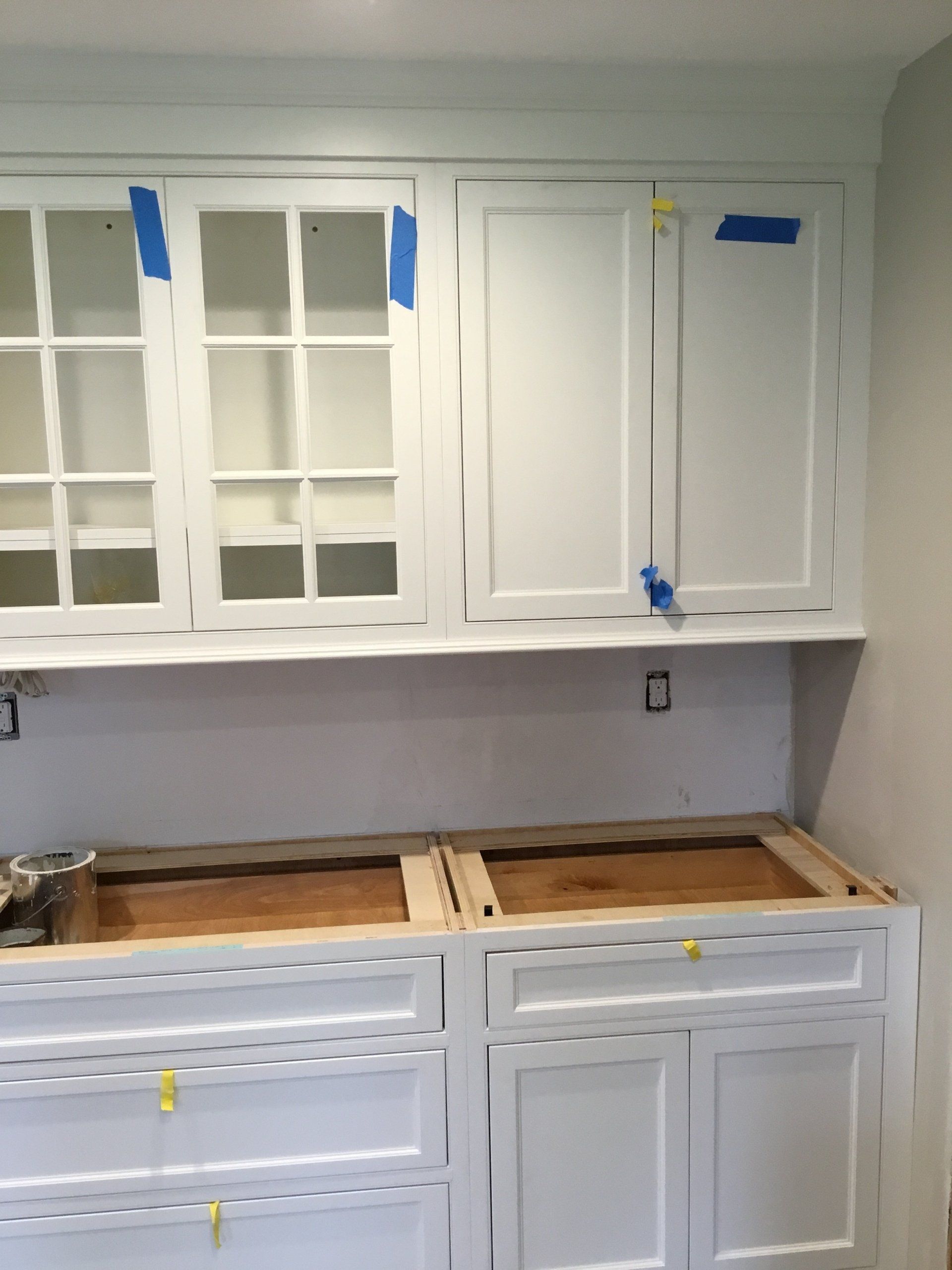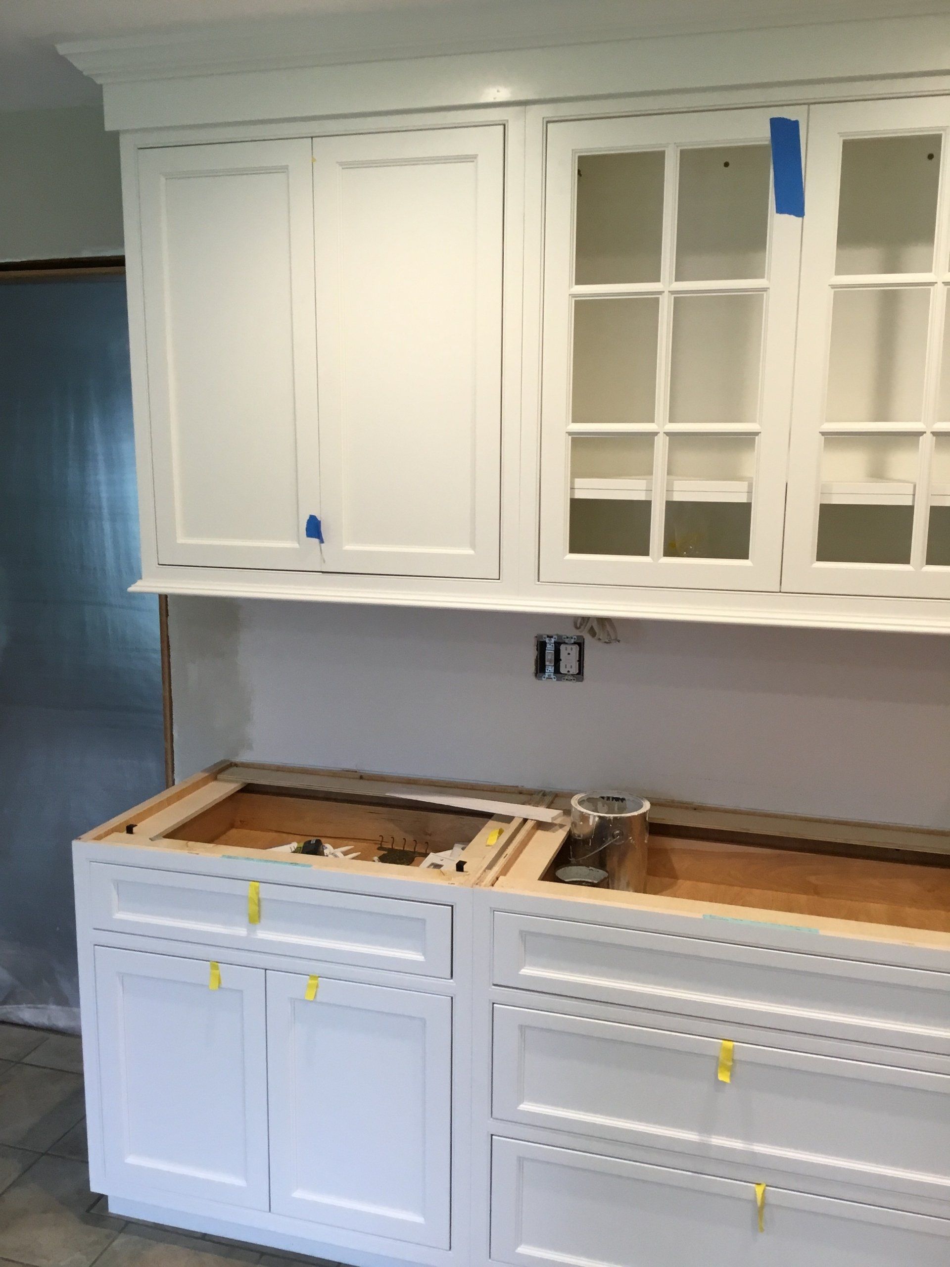 All white custom kitchen /glass doors/ appliance built ins /light rail /recessed ceiling lighting/under cabinet lighting /tile floor