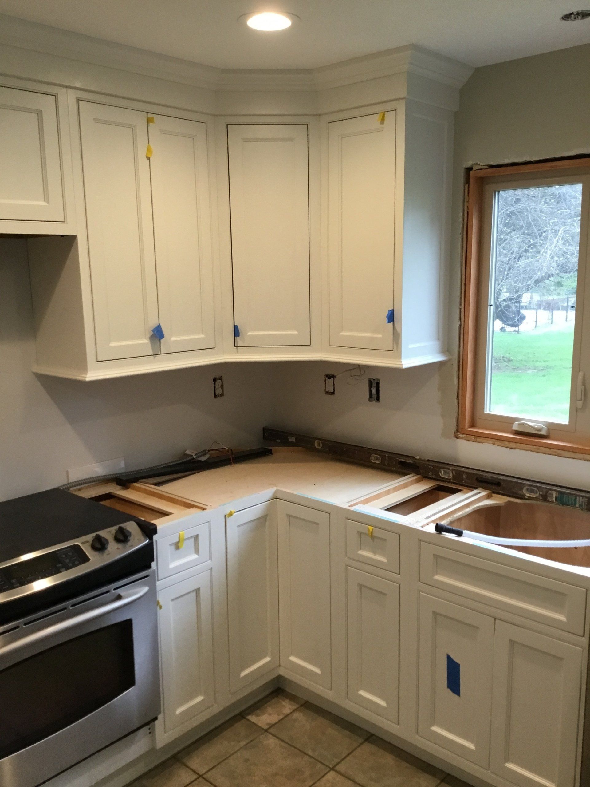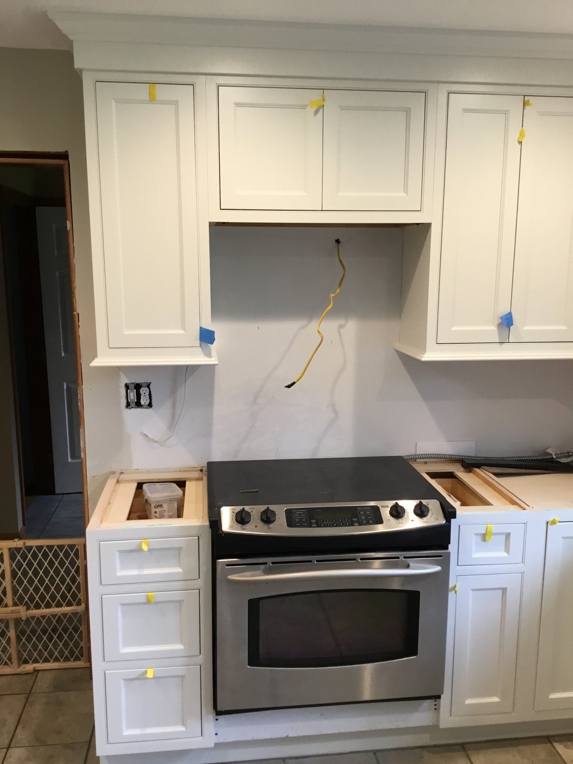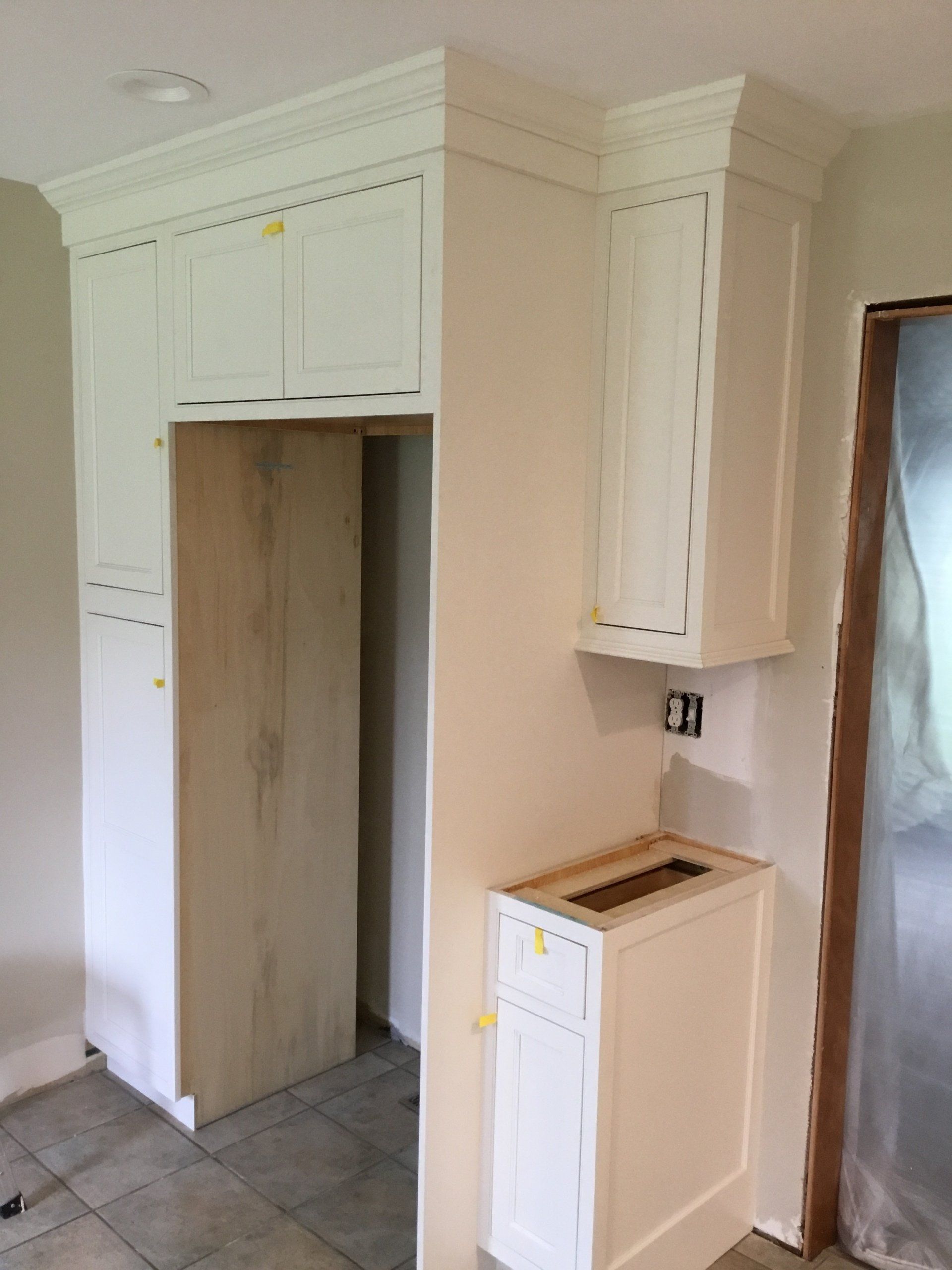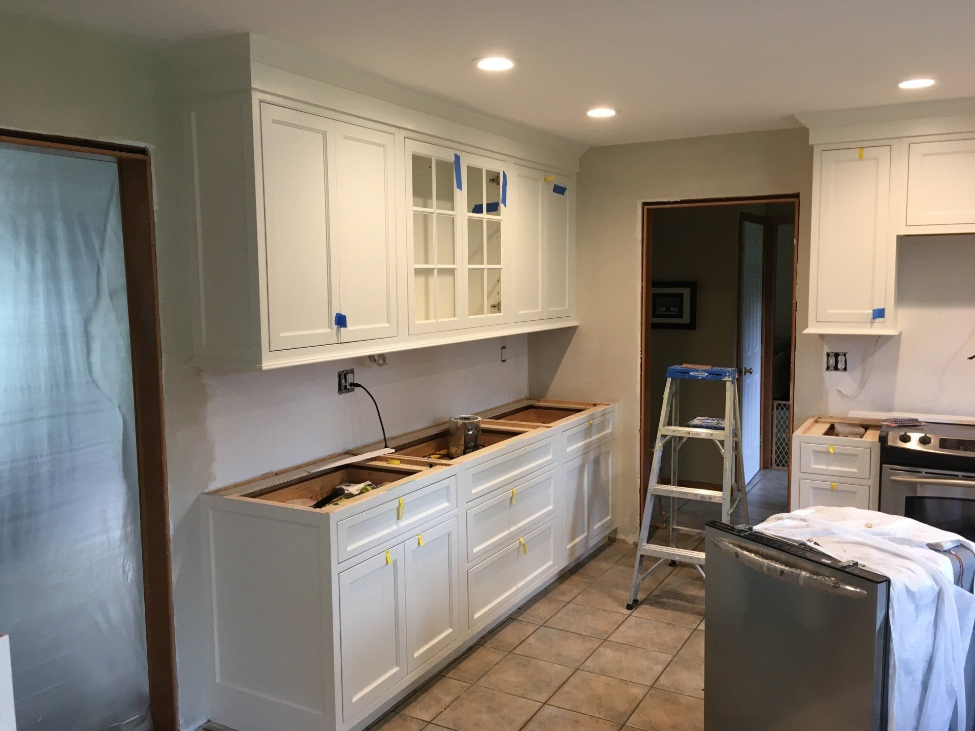 All white custom kitchen /glass doors/ appliance built ins /light rail /recessed ceiling lighting/under cabinet lighting /tile floor