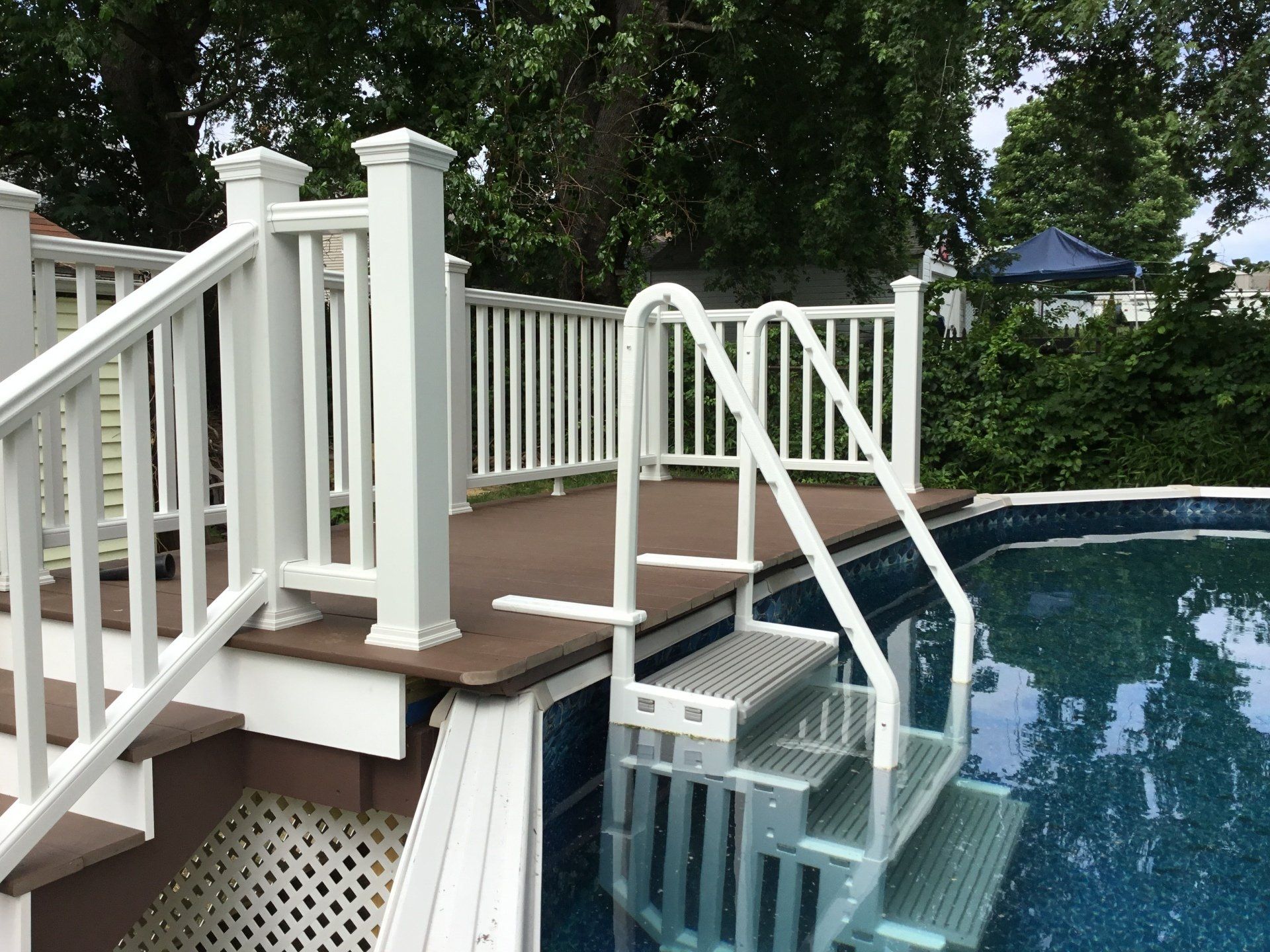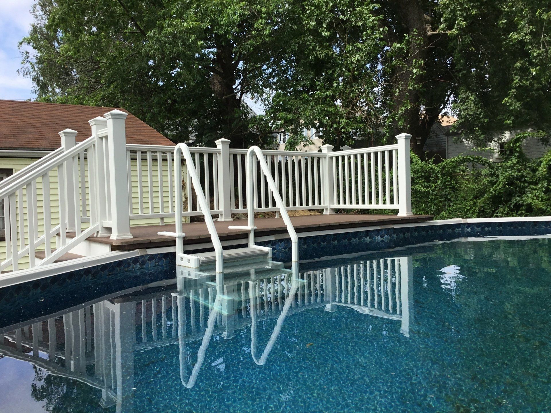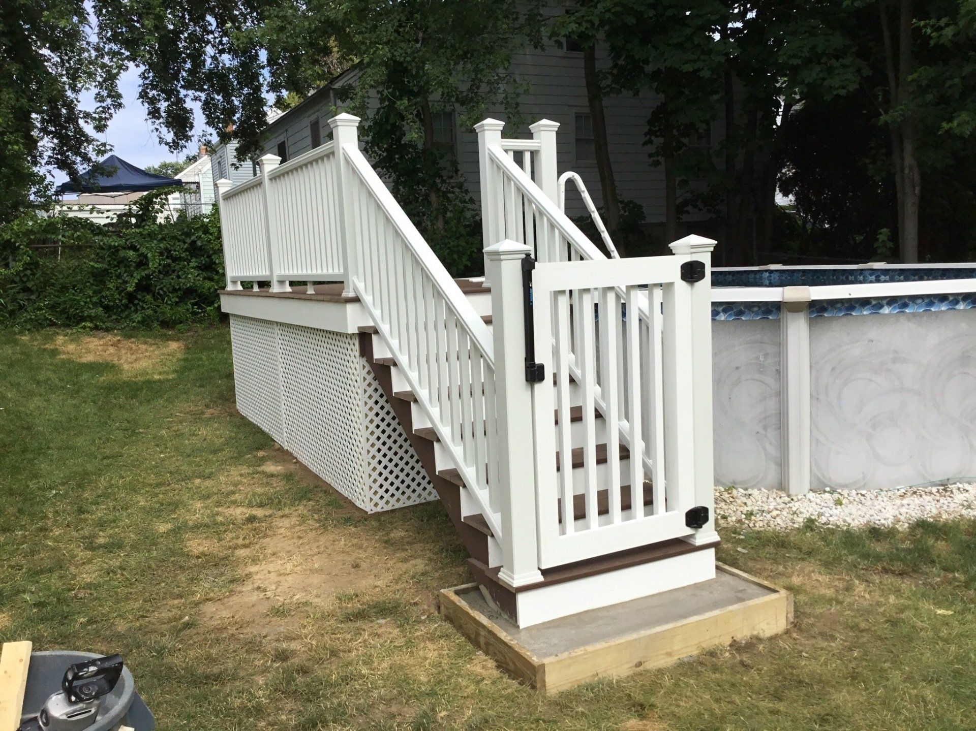 Pool deck with all white railings / Azek (mahogany ) decking Lattice and locking gate