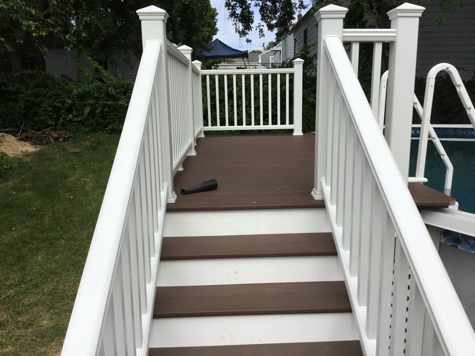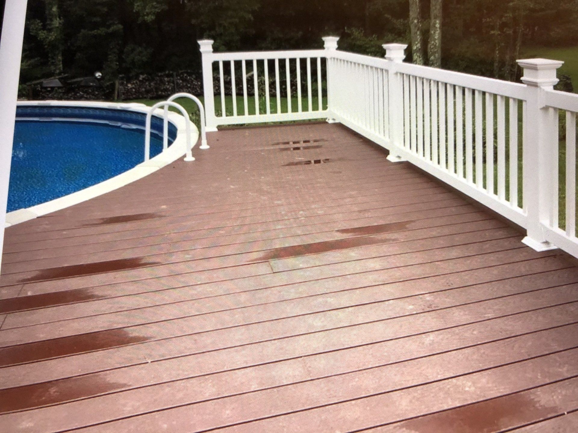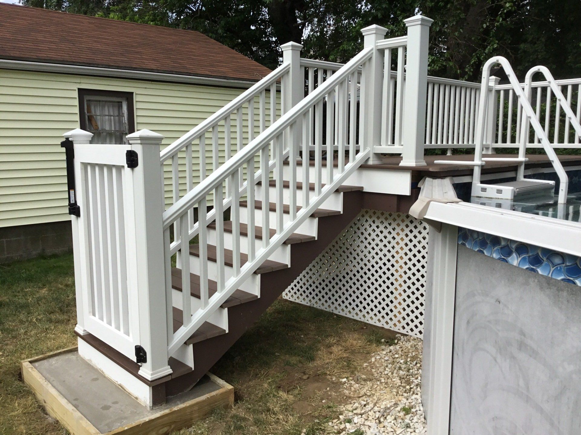 Pool deck with all white railings / Azek (mahogany ) decking Lattice and locking gate